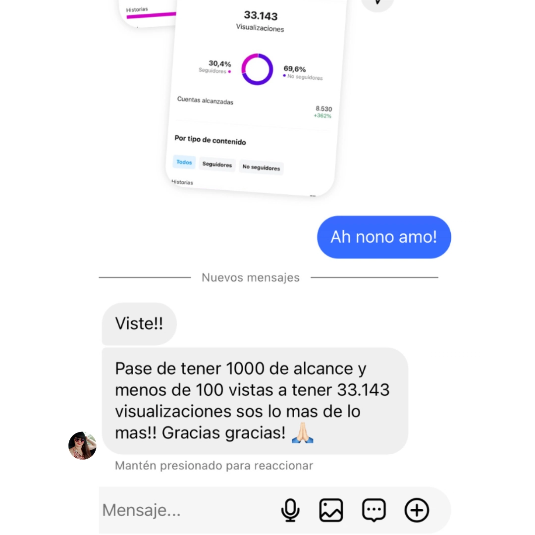 Queremos compartirles nuestra satisfacción al ver crecer nuestra cuenta de IG, de la mano de Ceci. Nuestro perfil mejoró muchísimo en cuanto a estética, contenido, interacciones, alcance y seguidores genuinos, generando una verdadera comunidad. Y eso es lo que más nos gusta.